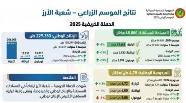 وبحسب معطيات نشرتها الوزارة عبر صفحتها الرسمية، بلغ إجمالي إنتاج الأرز الموريتاني خلال الموسم الحالي 229,353 طنًا، مقابل 180,299 طنًا في سنة 2024.