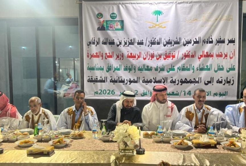 أقام سعادة السفير السعودي المعتمد بموريتانيا، الدكتور عبد العزيز بن عبدالله الرقابي، الليلة البارحة، مأدبة عشاء بمنزله في نواكشوط، بحضور وزيرا الشؤون الإسلامية والثقافة ومستشارا برئاسة الجمهورية، على شرف معالي الدكتور توفيق بن فوزان الربيعة وزير الحج والعمرة السعودي والوفد المرافق له، الذي يؤدي زيارة رسمية لموريتانيا هذه الأيام.