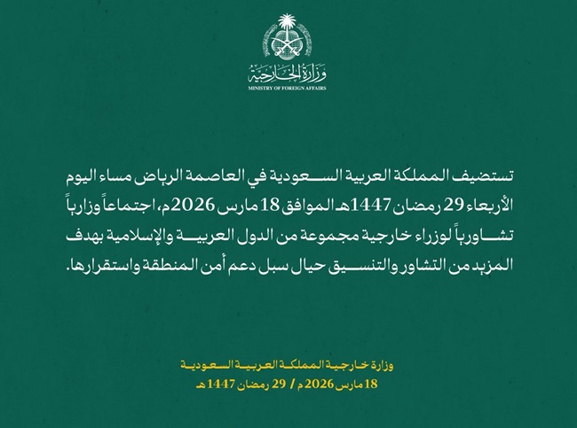 قالت وزارة الخارجية السعودية إن المملكة ستستضيف اجتماعا تشاوريا لوزراء ​خارجية مجموعة من الدول العربية والإسلامية في الرياض مساء اليوم الأربعاء "بهدف المزيد من التشاور والتنسيق حيال سبل دعم أمن المنطقة واستقرارها".