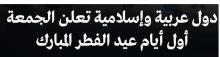 أعلنت 12 دولة عربية وإسلامية رسميًا أن يوم الجمعة 20 مارس/آذار 2026 سيكون أول أيام عيد الفطر المبارك بعد تحري هلال شوال مساء اليوم الأربعاء 18 مارس/آذار 1447هجرية