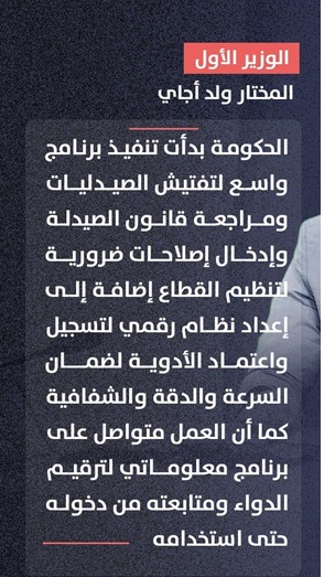 وأضاف الوزير الاول أن العمل جارٍ على إعداد نظام رقمي لتسجيل واعتماد الأدوية بهدف ضمان السرعة والدقة والشفافية.