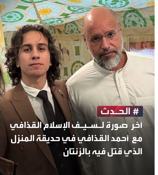 الكشف عن آخر صورة لسيف الإسلام القذافي مع أحمد القذافي في حديقة المنزل الذي قتل فيه بالزنتان بقية الصور:
