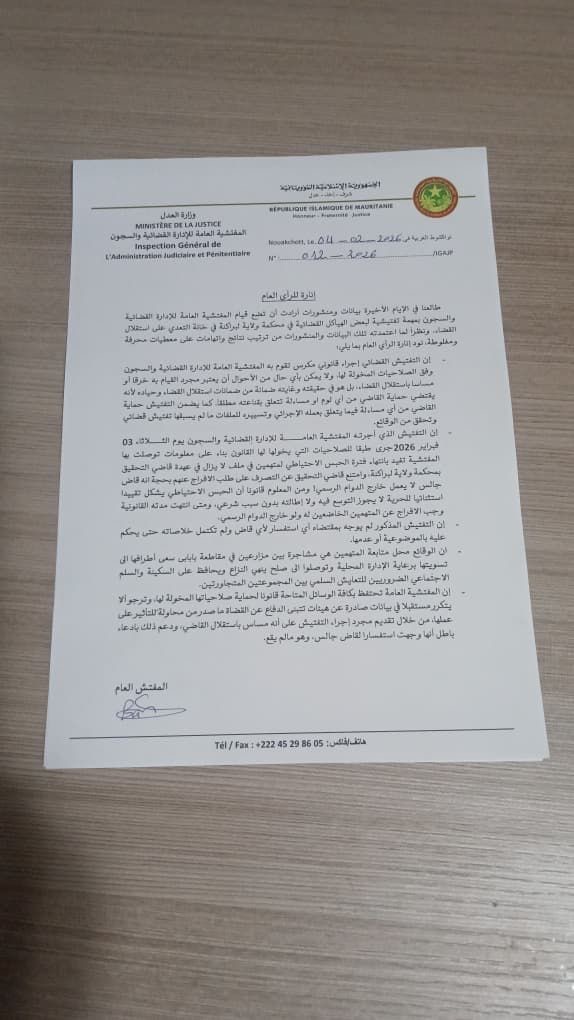 أصدرت المفتشية العامة للإدارة القضائية والسجون بياناً توضيحياً للرأي العام، أكدت فيه أن المهمة التفتيشية التي شملت بعض الهياكل القضائية بمحكمة ولاية لبراكنة مؤخراً، تندرج ضمن صلاحياتها القانونية، نافيةً بشدة أن يكون الإجراء مساساً باستقلال القضاء.